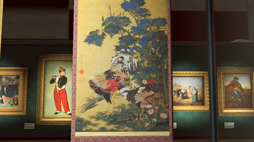 A detailed, colorful, and dynamic piece by Itō Jakuchū, a successful Kyoto artist in the mid-Edo period. High-quality paints on silk help it maintain its brilliant color even now, 200 years after its creation.